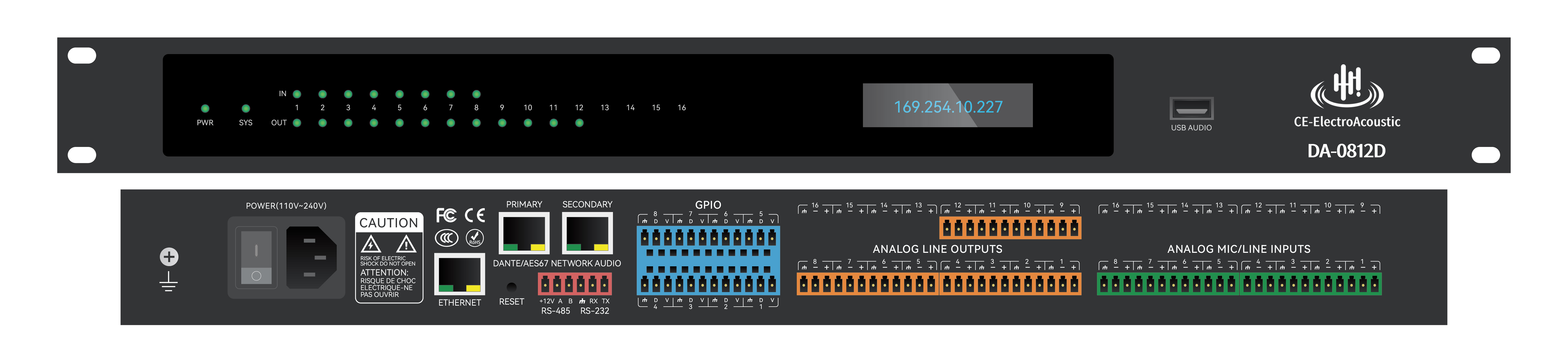 处理器内部含有可配置操作的参量均衡处理、反馈抑制器、延时、压缩器、路由矩阵、播放器等音频处理器件,产品支持定制二次开发;支持双机热备份、双网络热备份、内置通用电源。